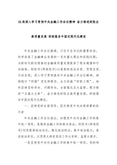 【七哥公文】2024年:XX局深入学习贯彻中央金融工作会议精神 奋力推进财险业高质量发展 积极服务中国式现代化建设+更多免费公文+VX:QiGeGongWen2024