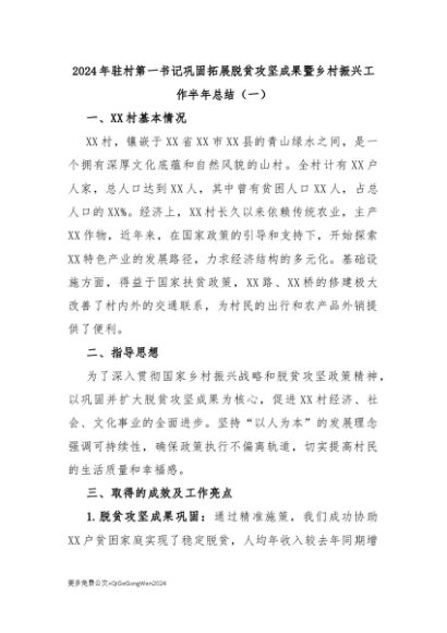 【七哥公文】2024年:2024年驻村第一书记巩固拓展脱贫攻坚成果暨乡村振兴工作半年总结+更多免费公文+VX:QiGeGongWen2024
