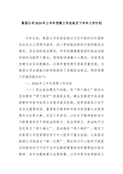 【七哥公文】2024年:集团公司2024年上半年党建工作总结及下半年工作计划+更多免费公文+VX:QiGeGongWen2024