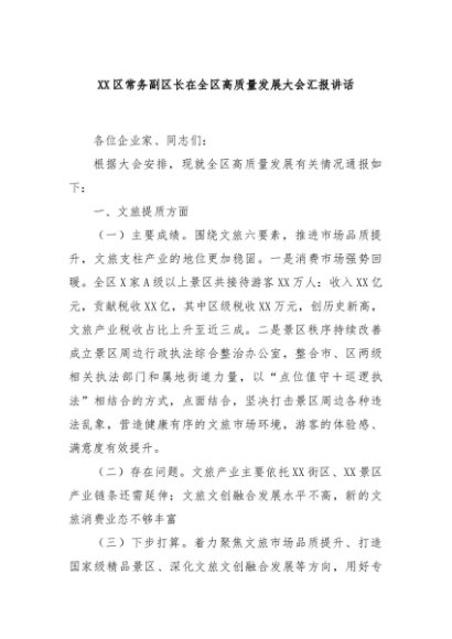 / 【七哥公文】2024年:XX区常务副区长在全区高质量发展大会汇报讲话+更多免费公文+VX:QiGeGongWen2024