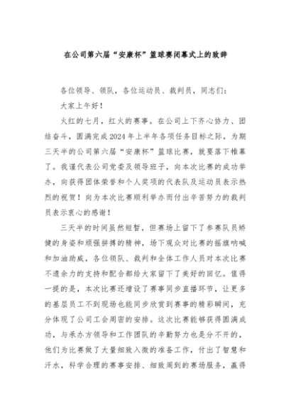 / 【七哥公文】2024年:在公司第六届“安康杯”篮球赛闭幕式上的致辞+更多免费公文+VX:QiGeGongWen2024
