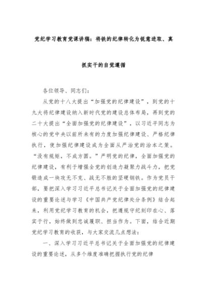【七哥公文】2024年:党纪学习教育党课讲稿:将铁的纪律转化为锐意进取、真抓实干的自觉遵循+更多免费公文+VX:QiGeGongWen2024