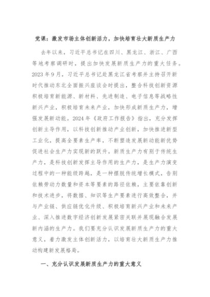 【七哥公文】2024年:党课:激发市场主体创新活力,加快培育壮大新质生产力+更多免费公文+VX:QiGeGongWen2024