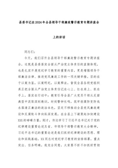 【七哥公文】2024年:县委书记在2024年全县领导干部廉政警示教育专题讲座会上的讲话+更多免费公文+VX:QiGeGongWen2024
