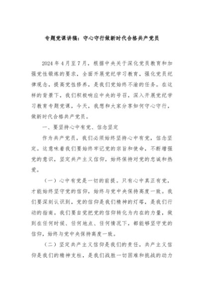 / 【七哥公文】2024年:专题党课讲稿:守心守行做新时代合格共产党员+更多免费公文+VX:QiGeGongWen2024