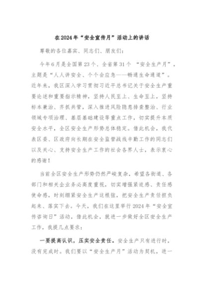 / 【七哥公文】2024年:在2024年“安全宣传月”活动上的讲话+更多免费公文+VX:QiGeGongWen2024