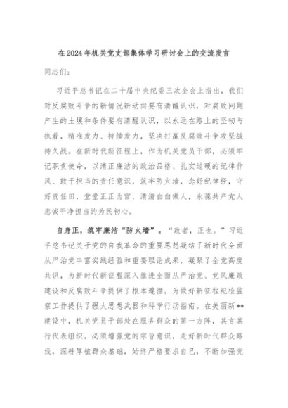 / 【七哥公文】2024年:在2024年机关党支部集体学习研讨会上的交流发言+更多免费公文+VX:QiGeGongWen2024