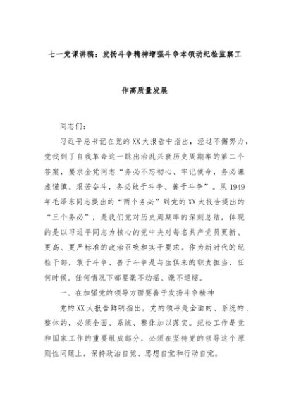 【七哥公文】2024年:七一党课讲稿:发扬斗争精神增强斗争本领动纪检监察工作高质量发展+更多免费公文+VX:QiGeGongWen2024