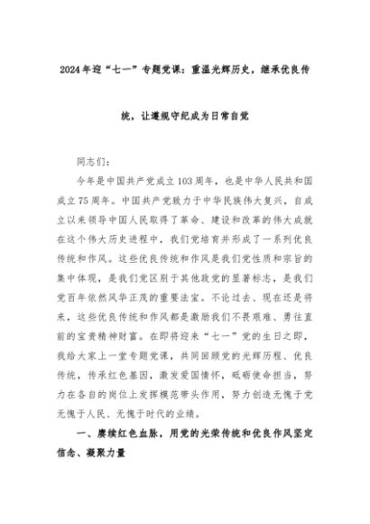 【七哥公文】2024年:2024年迎“七一”专题党课:重温光辉历史,继承优良传统,让遵规守纪成为日常自觉+更多免费公文+VX:QiGeGongWen2024