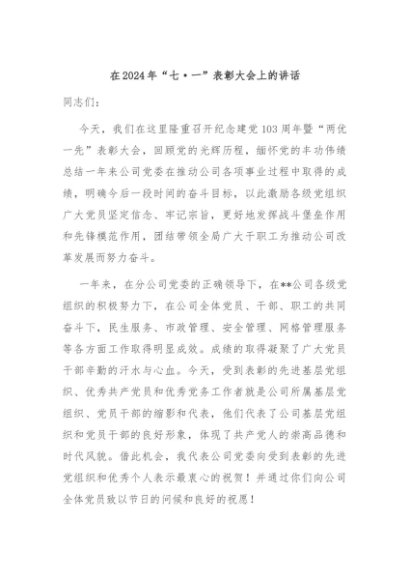 / 【七哥公文】2024年:在2024年“七·一”表彰大会上的讲话+更多免费公文+VX:QiGeGongWen2024