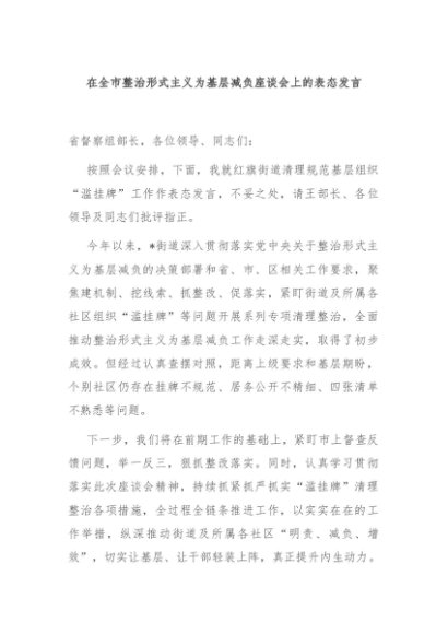 / 【七哥公文】2024年:在全市整治形式主义为基层减负座谈会上的表态发言+更多免费公文+VX:QiGeGongWen2024