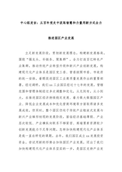 【七哥公文】2024年:中心组发言:从百年党史中汲取智慧和力量用新方式全力推进园区产业发展+更多免费公文+VX:QiGeGongWen2024