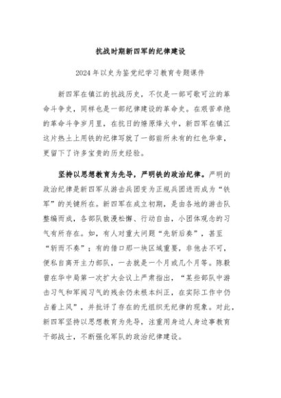 【七哥公文】2024年:以史为鉴党纪学习教育党课:抗战时期新四军的纪律建设(讲稿)+更多免费公文+VX:QiGeGongWen2024