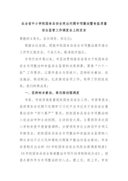 【七哥公文】2024年:在全省中小学校园食品安全突出问题专项整治暨食盐质量安全监管工作调度会上的发言+更多免费公文+VX:QiGeGongWen2024