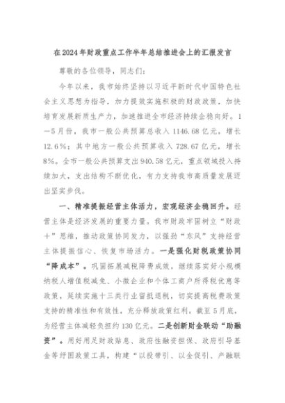 【七哥公文】2024年:在2024年财政重点工作半年总结推进会上的汇报发言+更多免费公文+VX:QiGeGongWen2024
