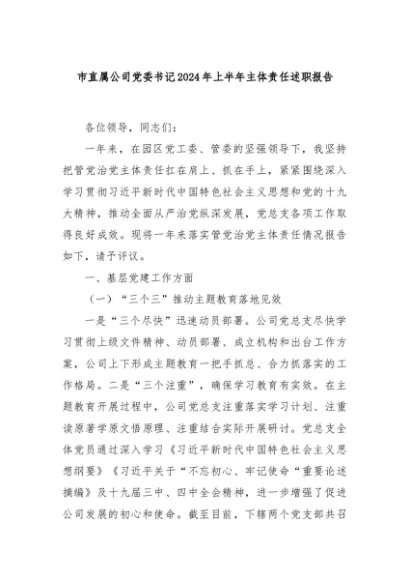 【七哥公文】2024年:市直属公司党委书记2024年上半年主体责任述职报告+更多免费公文+VX:QiGeGongWen2024