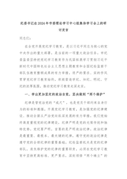【七哥公文】2024年:纪委书记在2024年市委理论学习中心组集体学习会上的研讨发言+更多免费公文+VX:QiGeGongWen2024