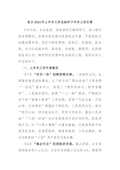 / 【七哥公文】2024年:某乡2024年上半年工作总结和下半年工作打算+更多免费公文+VX:QiGeGongWen2024
