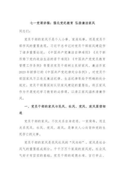 / 【七哥公文】2024年:七一党课讲稿:强化党纪教育 弘扬廉洁家风+更多免费公文+VX:QiGeGongWen2024