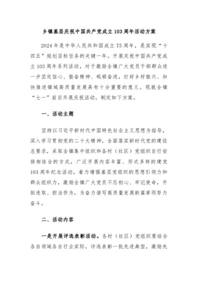 / 【七哥公文】2024年:庆祝中国共 产 党成立103周年活动方案模板+更多免费公文+VX:QiGeGongWen2024