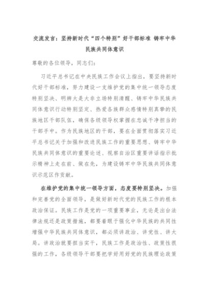 【七哥公文】2024年:交流发言:坚持新时代“四个特别”好干部标准 铸牢中华民族共同体意识+更多免费公文+VX:QiGeGongWen2024