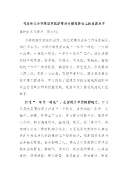 / 【七哥公文】2024年:司法局在全市基层党组织建设专题推进会上的交流发言+更多免费公文+VX:QiGeGongWen2024