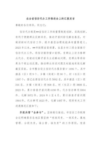 / 【七哥公文】2024年:在全省信访代办工作推进会上的汇报发言+更多免费公文+VX:QiGeGongWen2024