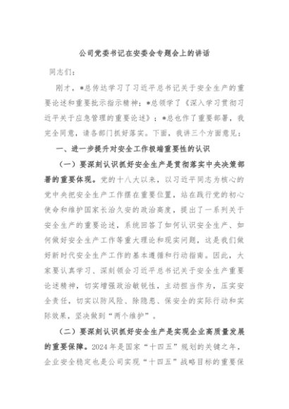 / 【七哥公文】2024年:公司党委书记在安委会专题会上的讲话+更多免费公文+VX:QiGeGongWen2024