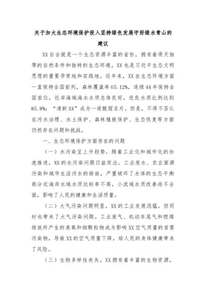 【七哥公文】2024年:关于加大生态环境保护投入坚持绿色发展守好绿水青山的建议+更多免费公文+VX:QiGeGongWen2024