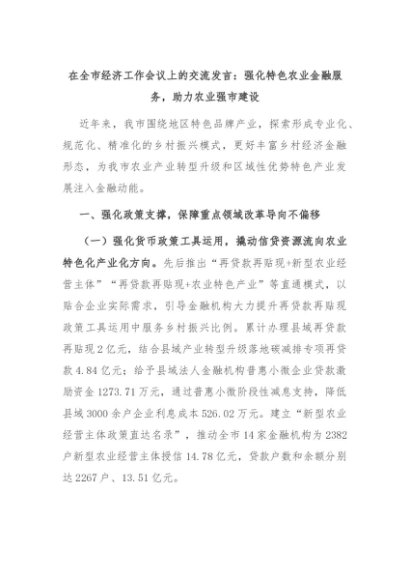 【七哥公文】2024年:在全市经济工作会议上的交流发言:强化特色农业金融服务,助力农业强市建设+更多免费公文+VX:QiGeGongWen2024