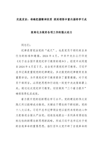 【七哥公文】2024年:交流发言:准确把握精神实质 深刻领悟丰富内涵将学习成效转化为做好各项工作的强大动力+更多免费公文+VX:QiGeGongWen2024