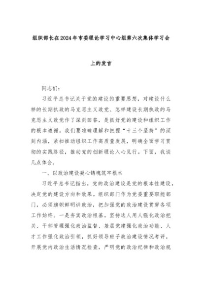 【七哥公文】2024年:组织部长在2024年市委理论学习中心组第六次集体学习会上的发言+更多免费公文+VX:QiGeGongWen2024