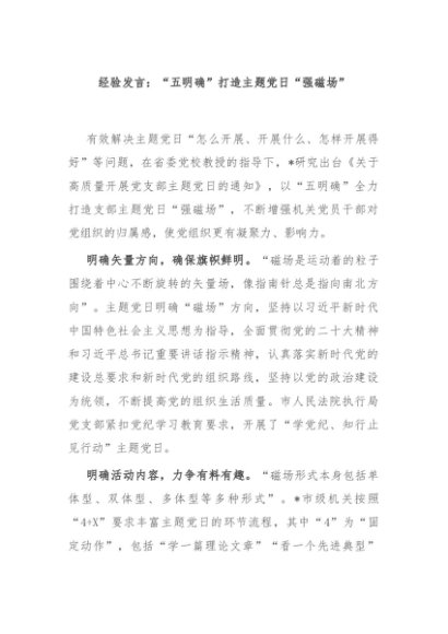 / 【七哥公文】2024年:经验发言:“五明确”打造主题党日“强磁场”+更多免费公文+VX:QiGeGongWen2024