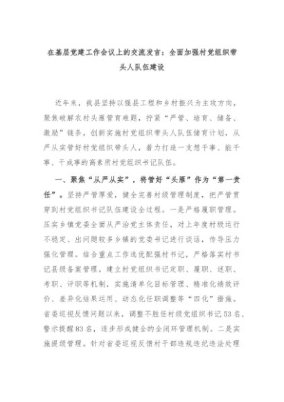 【七哥公文】2024年:在基层党建工作会议上的交流发言:全面加强村党组织带头人队伍建设+更多免费公文+VX:QiGeGongWen2024
