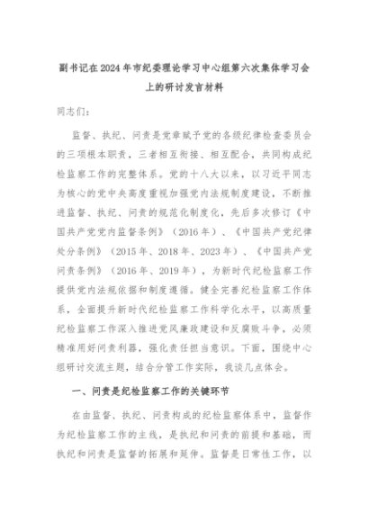 【七哥公文】2024年:副书记在2024年市纪委理论学习中心组第六次集体学习会上的研讨发言材料+更多免费公文+VX:QiGeGongWen2024