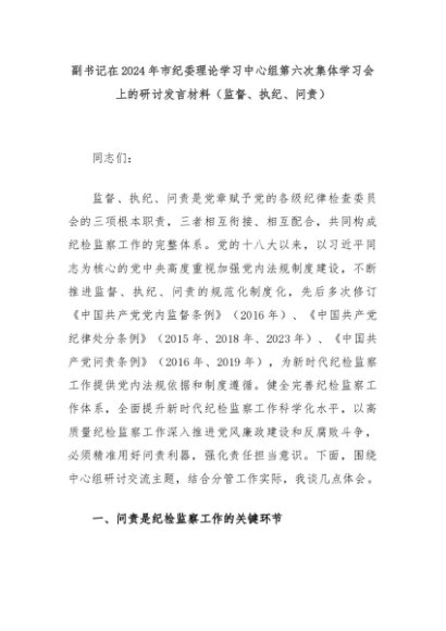 【七哥公文】2024年:副书记在2024年市纪委理论学习中心组第六次集体学习会上的研讨发言材料(监督、执纪、问责)+更多免费公文+VX:QiGeGongWen2024