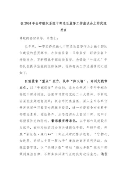 【七哥公文】2024年:在2024年全市组织系统干部选任监督工作座谈会上的交流发言+更多免费公文+VX:QiGeGongWen2024