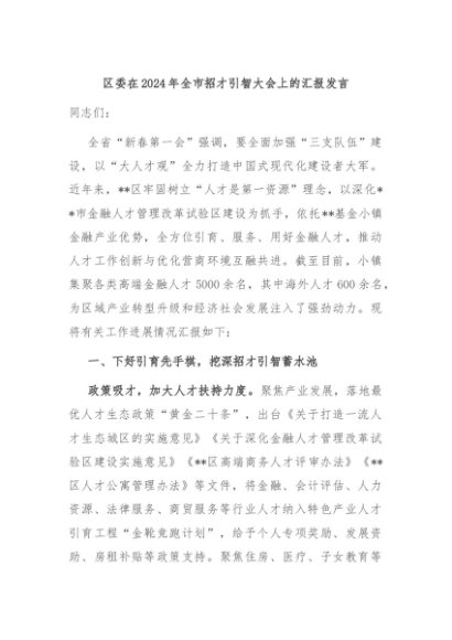 / 【七哥公文】2024年:区委在2024年全市招才引智大会上的汇报发言+更多免费公文+VX:QiGeGongWen2024