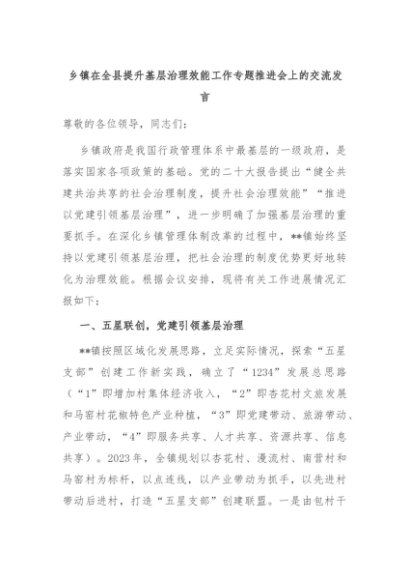 【七哥公文】2024年:乡镇在全县提升基层治理效能工作专题推进会上的交流发言+更多免费公文+VX:QiGeGongWen2024