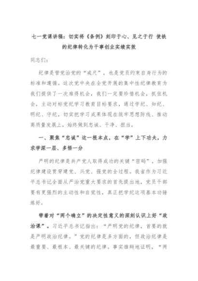 【七哥公文】2024年:七一党课讲稿:切实将《条例》刻印于心、见之于行 使铁的纪律转化为干事创业实绩实效+更多免费公文+VX:QiGeGongWen2024