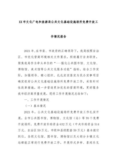 【七哥公文】2024年:XX市文化广电和旅游局公共文化基础设施场所免费开放工作情况报告+更多免费公文+VX:QiGeGongWen2024