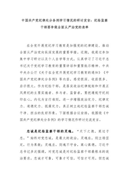 【七哥公文】2024年:中国共产党纪律处分条例学习情况的研讨发言:纪检监察干部要争做全面从严治党的表率+更多免费公文+VX:QiGeGongWen2024