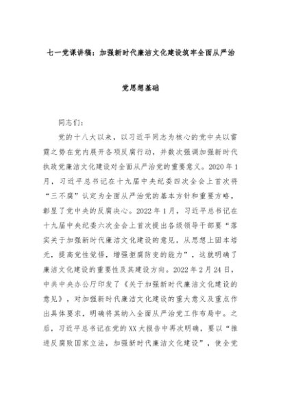 【七哥公文】2024年:七一党课讲稿:加强新时代廉洁文化建设筑牢全面从严治党思想基础+更多免费公文+VX:QiGeGongWen2024