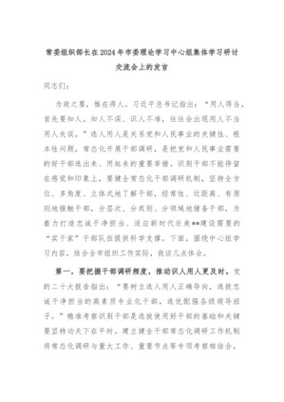 【七哥公文】2024年:常委组织部长在2024年市委理论学习中心组集体学习研讨交流会上的发言+更多免费公文+VX:QiGeGongWen2024