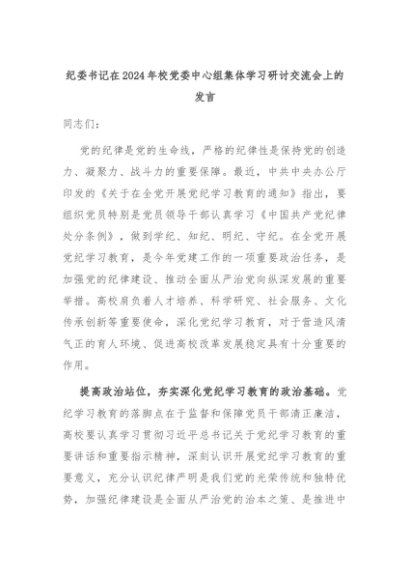 【七哥公文】2024年:纪委书记在2024年校党委中心组集体学习研讨交流会上的发言+更多免费公文+VX:QiGeGongWen2024