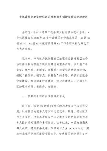 / 【七哥公文】2024年:市民政局创建省级社区治理和服务创新实验区经验材料+更多免费公文+VX:QiGeGongWen2024