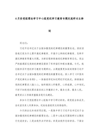 【七哥公文】2024年:6月份党组理论学习中心组党纪学习教育专题交流研讨主持词+更多免费公文+VX:QiGeGongWen2024