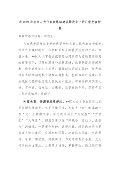 【七哥公文】2024年:在2024年全市人大代表联络站建设推进会上的汇报发言材料+更多免费公文+VX:QiGeGongWen2024