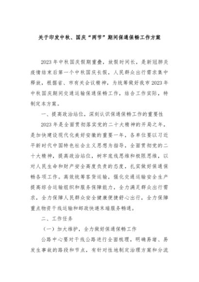 / 【七哥公文】2024年:关于印发中秋、国庆“两节”期间保通保畅工作方案+更多免费公文+VX:QiGeGongWen2024