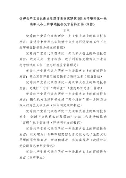 【七哥公文】2024年:优秀共产党员代表在生态环境系统建党103周年暨两优一先表彰大会上的事迹报告发言材料汇编(8篇)+更多免费公文+VX:QiGeGongWen2024